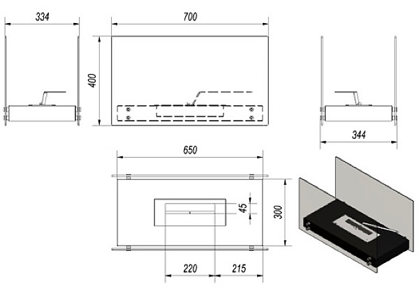 Корпус выполнен из огнеупорной толстой стали по технологии штамповки и точечной сварки. Поверхность декорирована несгораемой краской. Стеклянное ограждение по периметру защищает от открытого огня. Место вокруг горелки можно украсить камнями или муляжом из керамических поленьев. Камин функционирует на жидком биотопливе. Полного контейнера хватает на 5 часов горения, но для безопасности этанол заливают половину. После остывания панели отопительный бак дозаправляют, снова разжигают каминными спичками или длинной зажигалкой.
